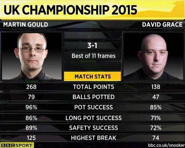 Grace, que veía como prácticamente estaba fuera del UK, se agarró a la mesa y logró ganar un frame que todo indicaba que se llevaría Martin Gould. Pero un error al embocar bola blanca dio opción a David Grace, que ya traía una buena renta de puntos, para resolver el frame y acercarse un poco más a Gould. Ganaba dos frames consecutivos y se ponía 5-3 abajo.