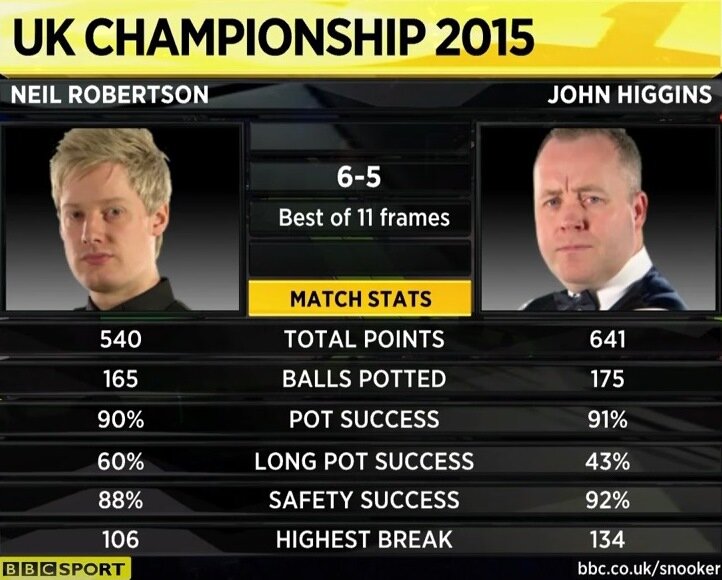 Neil veía cómo la bestia se despertaba en el peor momento para sus intereses propios y debía hacer algo urgentemente para frenar el ciclo escocés, que no estaba dispuesto a frenar su buen juego, y volvió a coger el control del partido y todo indicaba que tendríamos decider en breve con un Higgins con cara de malo (señal de que está muy concentrado) pero (bad boy) cometía un grave error y brindó el partido al canguro al que, por primera vez en el torneo, se le vio acusar la presión cometiendo un error que devolvía el turno a Higgins que, con un break de 66 puntos, lograba el ansiado decider. Daba comienzo el último frame y el partido entró en una senda de múltiples errores por ambas partes, con Neil algo más efectivo ya que sumaba algunos puntos y Higgins sólo cometía error tras error con bolas rojas (fallando 5 consecutivas). Cuando todo parecía hecho para Neil llegó un error que daba la última oportunidad a Higgins, que esta vez sí que embocó bola roja y disponía de una mesa para ganar el frame y el partido para el desespero de Neil, que veía cómo el escocés le regalaba el partido al fallar una bola verde sencilla a tronera central. El australiano no perdonó y cerró el frame y un partido que pasará la historia del UK.