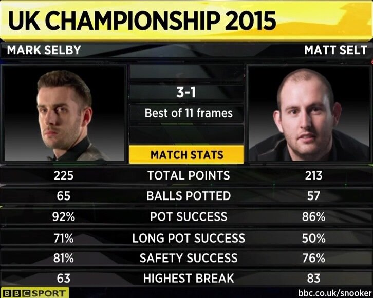 El número 1 del mundo comenzó su partido con gran autoridad, tal y como hizo con el tailandés Poomjaeng. Todo indicaba que ganaría el primer frame con facilidad, pero un error de emplazamiento dio paso a Selt, comenzando una lucha frenética por ganar el primer frame; un frame muy emocionante que caía del lado de Mark Selby tras un error defensivo de Matthew Selt, poniendo el 1-0 en el marcador. El segundo frame fue dominado por el de Leicester, que lograba poner el 2 a 0 con un break de 63 puntos en el frame. Selt veía cómo su rival ponía tierra de por medio y debía reaccionar si no quería ver cómo se marchaba el número 1 del mundo al descanso con el partido visto para sentencia. Y a ello se puso y con una gran concentración comenzó a construir un break que, a la postre, sería definitivo (87) sin dar opciones de réplica a su compatriota. Nos quedaba un frame antes del descanso que dictaría el camino del partido, ya que de perderlo a Selt se le pondría el pase a semifinales muy cuesta arriba. El de Romford comenzó dispuesto a poner el empate a dos, pero un gravísimo error al inicio del frame dio el turno a Selby, que no supo aprovechar la oportunidad y Selt recuperaba el turno con una gran bola larga que le reconfortó con una ventaja de 35 puntos en el marcador y la tranquilidad de ir por delante en el frame para los momentos finales del mismo. Selt no tardó mucho en volver a coger el control pero un nuevo error daba paso a Selby. Matthew Selt sabía que para ganar a su compatriota no podía cometer ese tipo de errores, porque lo acabas pagando caro. Selby logró ajustar el marcador y se ponía 12 abajo (con 35 en mesa) y le pasaba la presión a Selt, que volvía a cometer un error (en este caso defensivo) y Mark Selby, como un grande que es, no perdonó y cerró el frame antes del descanso. Ponía el 3 a 1 en el marcador sin hacer un gran snooker.