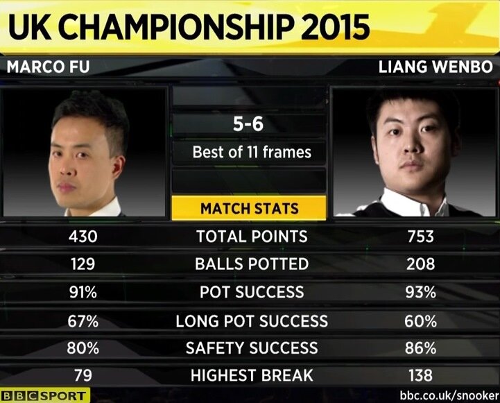 El descanso le sentó bien a Marco Fu, pues lograba tener más continuidad en la mesa y conseguía un frame vital para su moral, colocándose a tan sólo uno de su rival (3-2). Sin embargo Wenbo quería debilitar a Fu y lo consiguió ganando el sexto frame con dos buenos breaks. Volvía a colocarse con dos frames de ventaja sobre su rival (4-2). El jugador chino no quería más finales apretados (como los que tuvo con Judd Trump y Tom Ford) y se puso manos a la obra para lograrlo. Consiguió tener el frame con 67 puntos arriba y 67 en mesa, pero dio paso a Fu que se veía obligado a hacer snookers para no verse contra las cuerdas. Sin embargo no pudo evitarlo y el séptimo frame también caía del lado de Wenbo (5-2). El jugador chino no bajaba el ritmo y seguía enchufado y dispuesto a terminar por la vía rápida. Pero un error con 45 puntos arriba hizo entrar a Marco Fu, que tenía una buena opción de seguir vivo en el partido. El hongkonés no desaprovechó la oportunidad y, tirando de experiencia y con mucha calma, sin precipitarse en ningún golpe puso el 5-3 en el marcador. Wenbo venía cómo Fu no se desesperaba y cómo poco a poco comenzaba a coger confianza, de tal manera que logró llevarse un frame que el jugador chino no supo jugar con la tranquilidad necesaria del momento (5-4). Fu comenzaba el siguiente frame embocando y, como jugador curtido en mil batallas, se llevaba el décimo frame para forzar un decider donde era el favorito, dada la remontada y el estado de nervios de Wenbo que, para sorpresa de todos, salió dispuesto a coger el control del último frame. Y así lo hizo; el jugador chino intentaba auto concienciarse de que tenía que pensar tras un error que dio paso a una guerra defensiva. Esta guerra era favorable para Fu, debido a la inexperiencia de Wenbo en estas citas. Pero Marco Fu también tuvo dudas, dando así muchas opciones a su rival que, poco a poco, se puso con una ventaja que forzaba a Fu a buscar snookers, logrando aumentar el nivel de emoción de un decider de infarto. Finalmente, tras unos intensos minutos de intercambios defensivos, Marco Fu cometía un grave error permitiendo a Wenbo entrar en mesa y embocar bolas para ganar el frame y el partido. Fu reconocía su derrota con un simpático gesto: colocaba su toalla sobre la cabeza de Wenbo cuando éste iba a embocar la rosa final.
