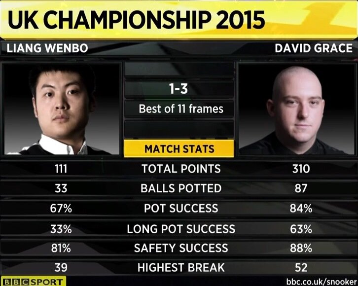 Los dos siguientes frames seguían en una línea ascendente de juego, aunque no llegaron a brillar por su grandes breaks a pesar del empeño de los dos jugadores. El de Leeds notaba más la presión que el jugador chino pero, a pesar de ello, supo resolver muy bien ambos frames con algún break decente y irse al descanso con una cómoda ventaja para afrontar la segunda parte del partido, que de buen seguro iba a ser muy emocionante debido a la importancia del torneo. Al descanso David Grace colocaba el 3-1 en el marcador.