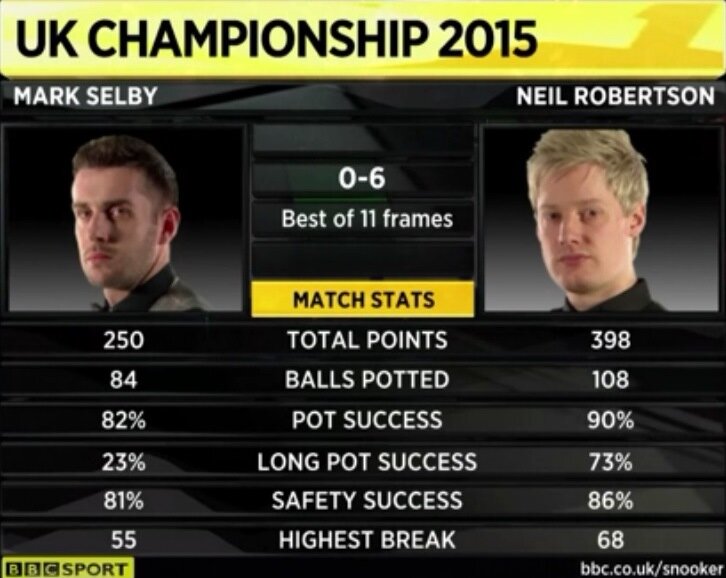 Neil Robertson v Mark Selby: 60-52 (MS 52), 69-55 (NR 68, MS 55), 78-26 (53), 73-20, 60-53, 58-44