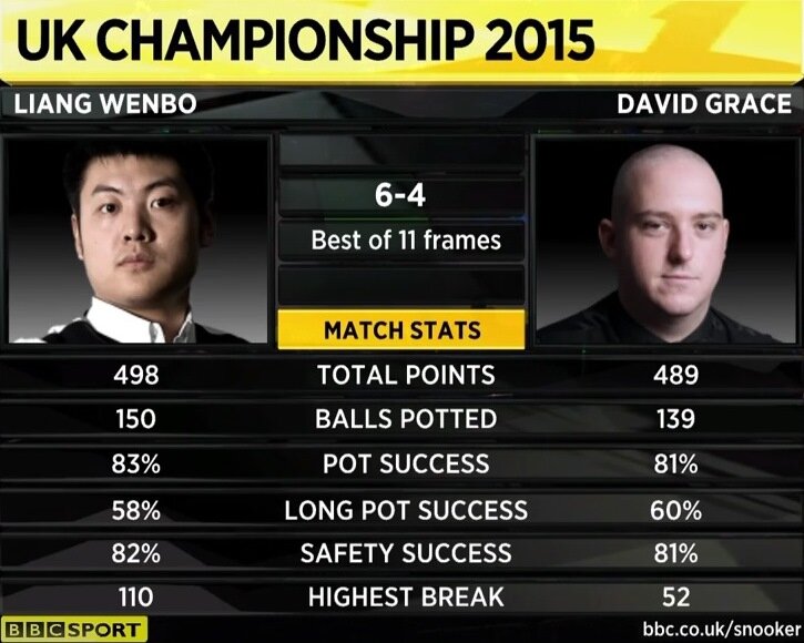 Liang Wenbo v David Grace: 61-55, 9-86, 41-93 (52), 0-76, 110-12 (110), 6-75, 58-9, 75-8, 71-20 (50), 67-55
