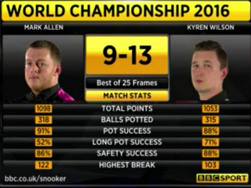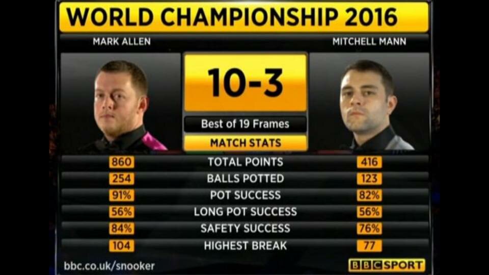 Mark Allen solventa su partido con un marcador que habla por si solo, remarcar la buena actuación del Mitchell Mann a los inicios del partido:
